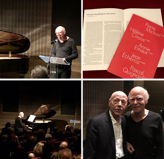Pascal Quignard a interprété au piano des pièces de Joseph Haydn, Kaoru Hakata, Jean de Sainte-Colombe ainsi que Le trio sur les morts de Nagasaki, un morceau de sa composition. Il a également lu pour l’occasion un extrait d’un texte inédit : Histoire du plongeur nocturne.